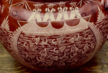 with lead glazes depicting the fisherman catching fish in nets. This village is located on the edge of Lake Patzcuaro.