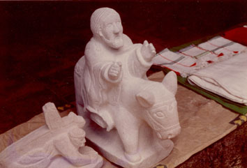 on a donkey,probably Jesus of Nazareth. Quarry stone carving was a living art when I lived there in 1972.