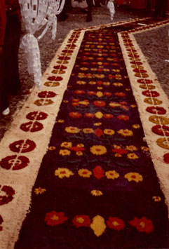 many long streets in the city of Patamban, Michoacan. This celebration happens every year. Dyed sawdust is used to